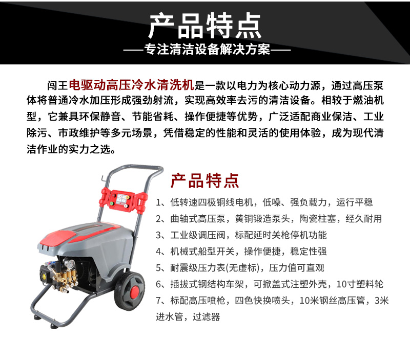 CWLD全电高压冷水机采用全电驱动设计,动力平稳、节能省耗,高压冷水冲刷力充足,可有效去除灰尘、泥沙、水垢、杂物等各类顽固污渍。设备结构扎实、操作便捷、移动灵活,适配工厂车间、机械设备、管道、养殖场、汽修厂、工程车辆等工业及商用清洁场景,可满足长时间连续作业需求,是一款稳定可靠的高压冷水清洗设备。